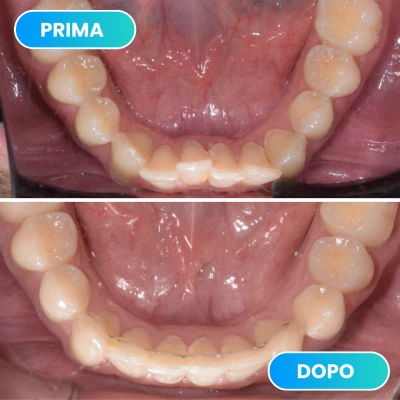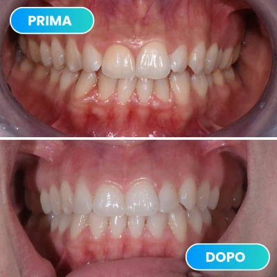 Illustrazione prima e dopo di un trattamento di ortodonzia a Firenze: confronto tra denti disallineati e il risultato finale con una dentatura perfettamente allineata
